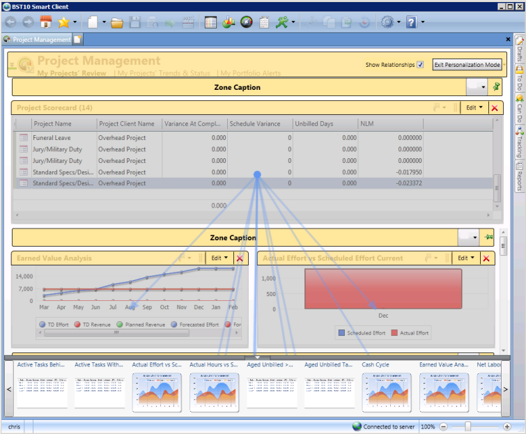 To understand how zones and visualizers relate to one another, highlight an item in the main list, and click the Show Relationships box next to the Exit Personalization Mode option. The visualizers related to the list item will be pointed to by blue arrows.