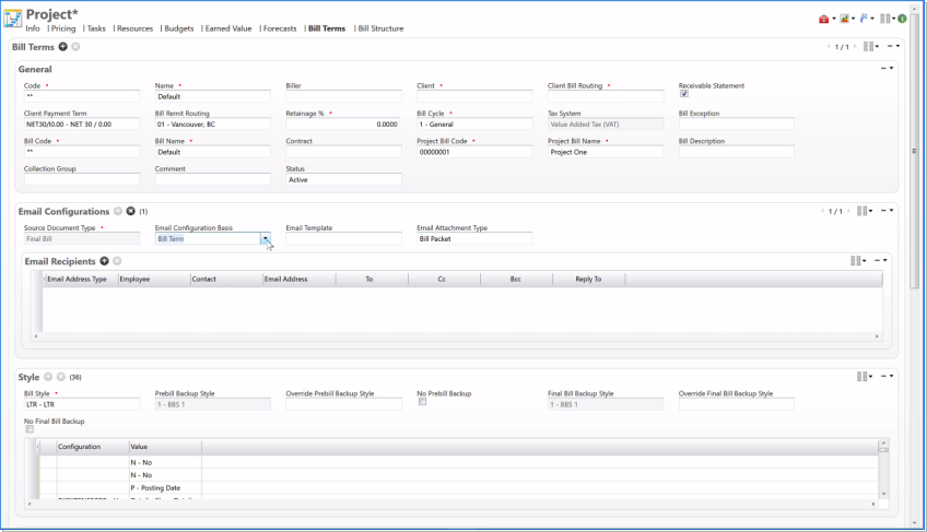| Prebill Backup Style | Displays a Prebill Backup Style if the Project Bill Term Bill Style has a Prebill Backup Style associated with it. All Project Bill Terms associated with this Bill Style will also use this Prebill Backup Style. This defaults to a Bill Backup Style if one exists for the Project Bill Term Bill Style or it is blank. | |