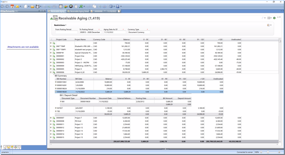 The Receivable Aging Inquiry allows you to query for and view project receivable information, which includes all project bill, deposit activity, and outstanding balances by time period (aging). The inquiry provides four levels of information, which include a summary of receivable balance and aging by project, a bill summary, a bill / deposit detail information, and associated general ledger transactions.