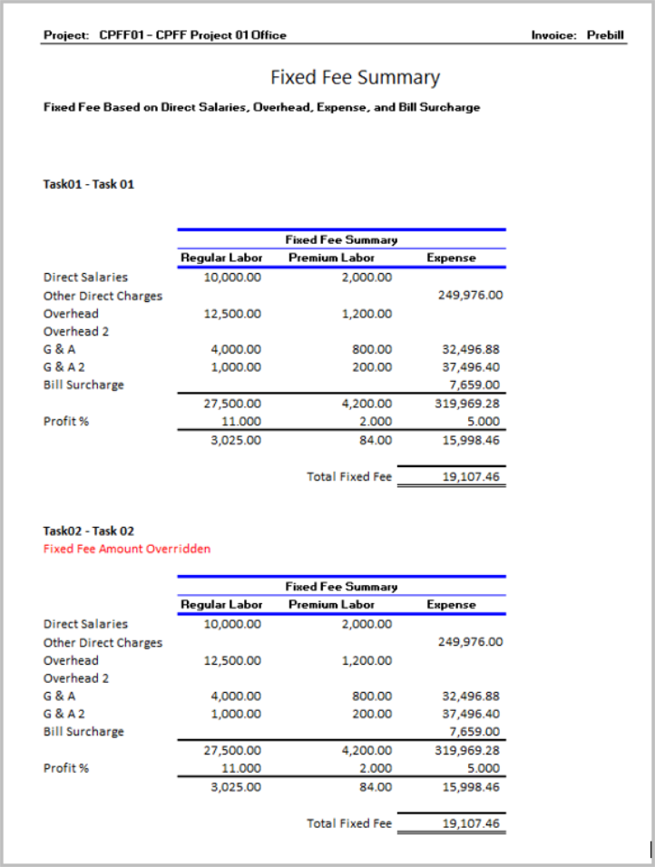 The Fixed Fee Summary will display after the report cover page if selected to display via the FIXEDFEESUMMARY, with options of Never, Prebill, Prebill and Final Bill. The fixed fee summary page includes a breakdown of the Fixed Fee Amount calculation. It is a summary for direct salaries, other direct charges, overhead and bill surcharges, and profit percentages for Regular Labor, Premium Labor, and Expenses. The values and calculation displayed is based on the CVFIXEDFEEBASIS selected, with options of D, DO, DOE, or DOES.